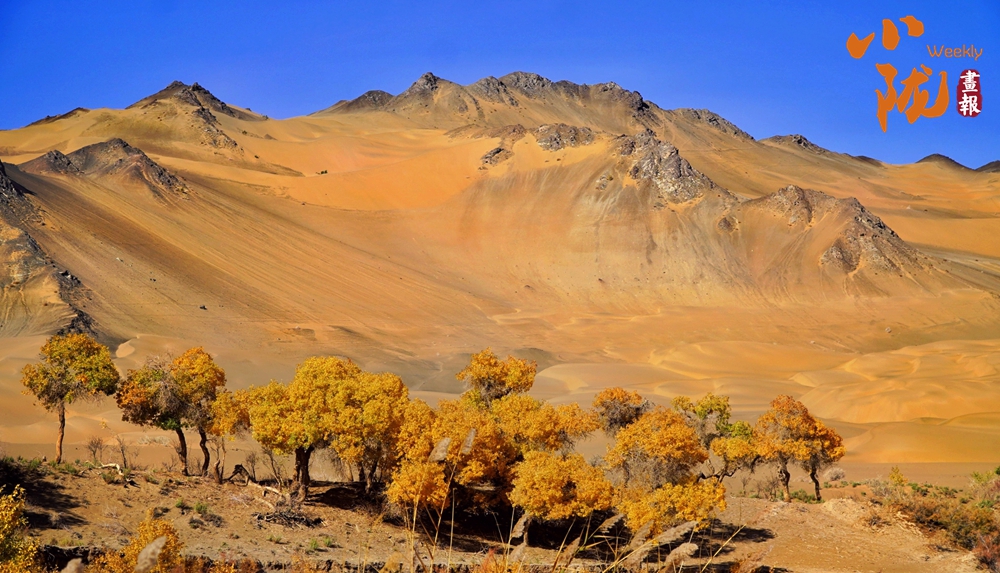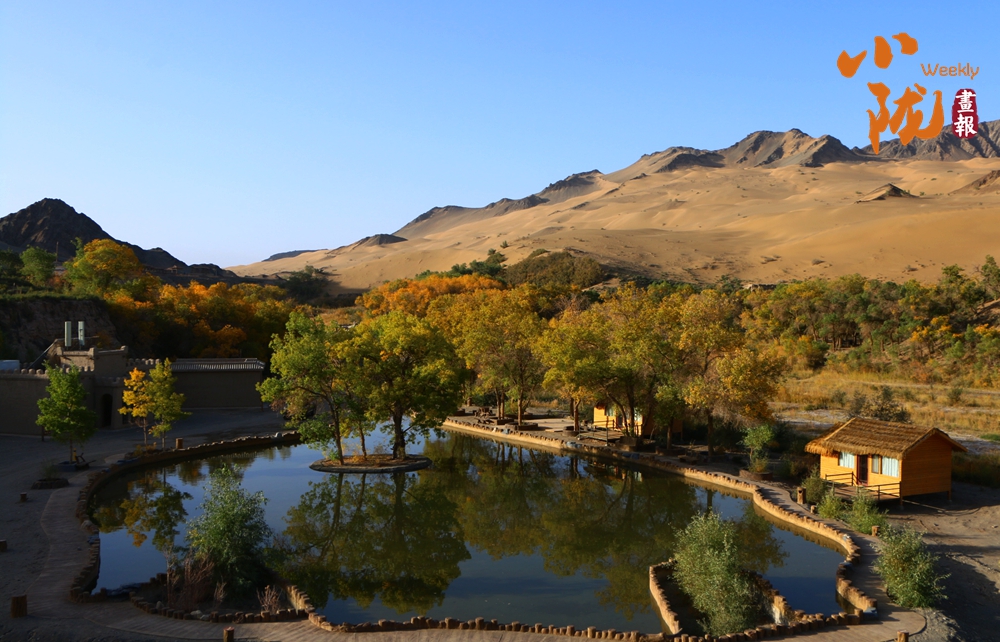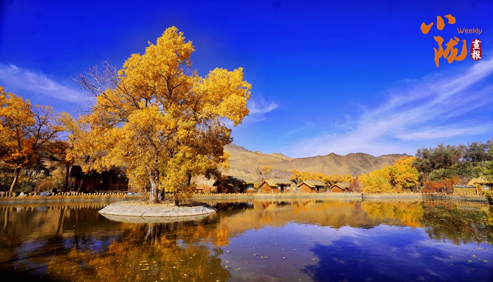 連綿起伏的沙丘如金色浪潮,環(huán)抱著一汪碧水,藍(lán)天白云倒映其中。金黃的胡楊在秋風(fēng)中輕輕搖曳,宛如一群身著華麗服飾的衛(wèi)士,默默守護(hù)著這片沙漠中的綠洲。