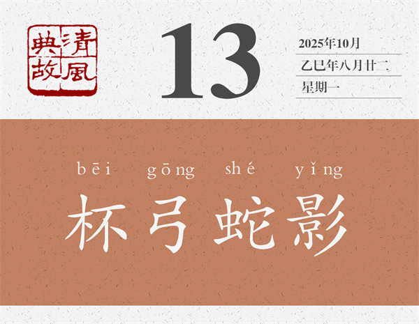 樂廣想,哪有這回事呢?當時,河南聽事堂墻壁上掛著一張弓,上面用漆畫著一條蛇。樂廣就想,這位朋友所見杯中之蛇,是不是這張弓的影子呢?于是,復原了上次喝酒的現場,讓客人坐在原來的位置上,將酒杯放在原來的地方上,問他“酒中復有所見不”,客人說“所見如初”。樂廣這才告訴他,杯中之蛇只是角弓之影而已。客人于是“豁然意解,沉疴頓愈”。后世即以“杯弓蛇影”為典,比喻疑神疑鬼,自相驚擾。明人袁宏道詩《病中和黃道元至日禪寺夢悉詩》:“消愁莫問弓蛇影,對境聊觀夢幻身。”
