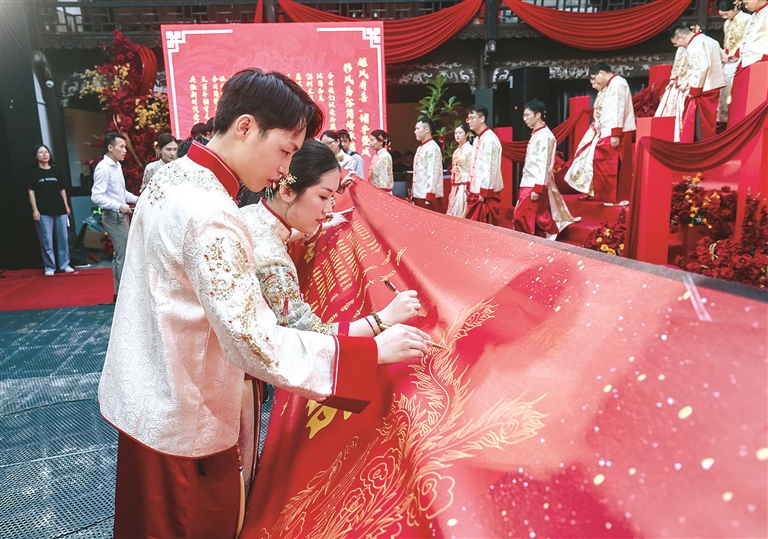 風成于上、俗化于下。近年來,越來越多新人選擇集體婚禮,倡導文明簡約的婚嫁理念,通過精心設計的集體婚禮儀式,打造既莊重又溫馨的婚禮體驗,既減輕經濟負擔、又傳承美好家風,倡導婚俗改革文明新風尚。圖為在浙江省諸暨市西施故里景區內,參加集體婚禮儀式的新人們簽訂移風易俗簡婚承諾。新華社記者 徐昱 攝