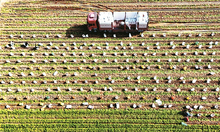 圖③:近日,河南省尉氏縣張市鎮張市村特色種植合作社的員工在種植園采收。新華社發(李新義 攝)