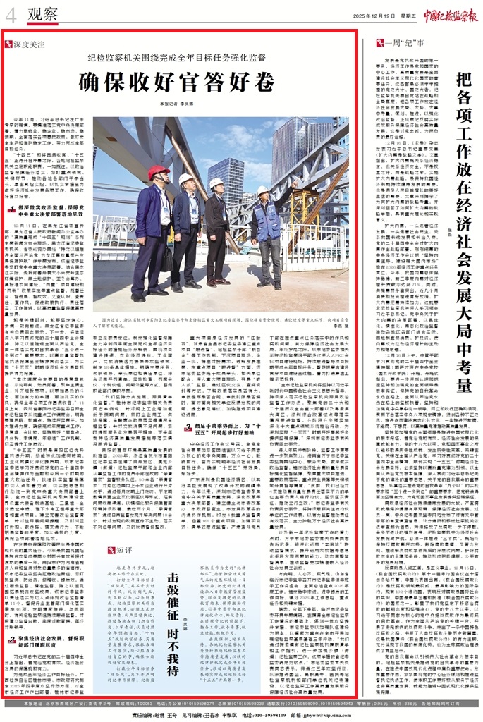 “十四五”即將圓滿收官、“十五五”正待開啟序幕之際,各地紀檢監察機關立足職能職責,一如既往,以政治監督保障任務落實,緊盯重點領域、關鍵環節,推動各地各部門干字當頭,拿出真招實招,以扎實舉措全力做好經濟社會發展各項工作,確保收好官交好卷。