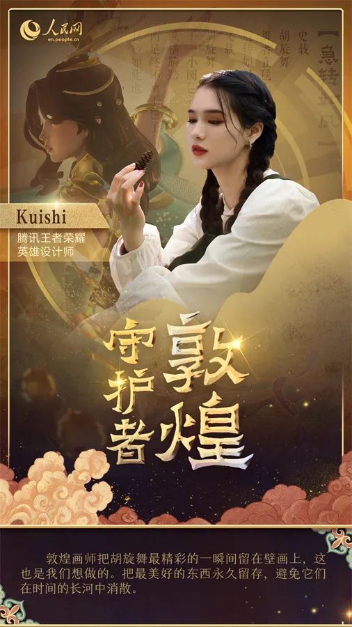 在敦煌千里之外的地方,騰訊的設計師們正在研發新的敦煌文化創新產品。熱門游戲《王者榮耀》的角色美術師Kuishi以莫高窟第220窟的壁畫為原型,為游戲角色設計了全新皮膚,將盛行于唐代的胡旋舞融入現代元素。