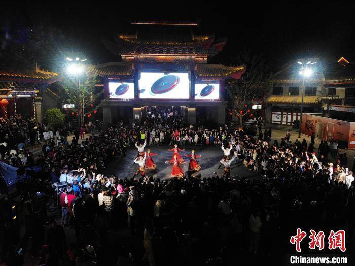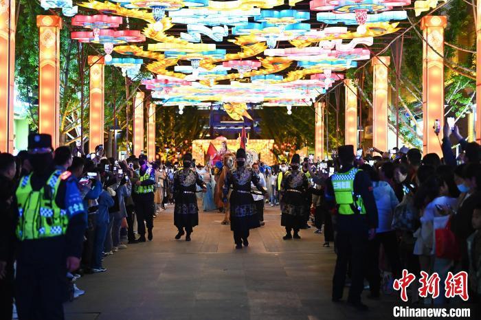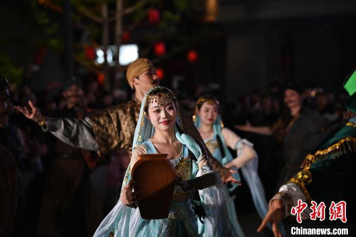 5月3日晚,甘肅省蘭州市七里河區蘭州老街上演的大型情景巡游《樓蘭之旅》吸引游客。李亞龍 攝
