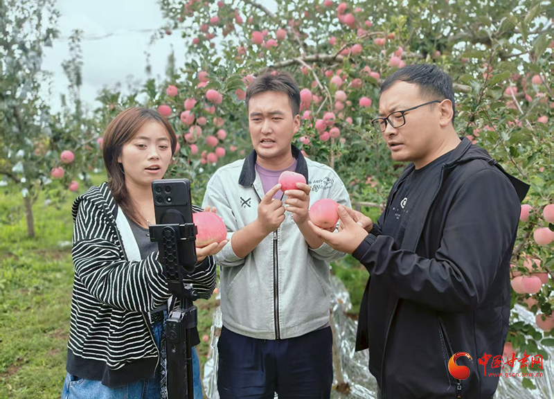 果園里,團隊又開始了新一輪直播,年輕主播手捧一顆嘎啦蘋果仔細講解,后臺訂單提示音此起彼伏。