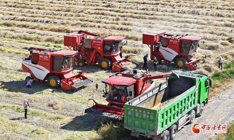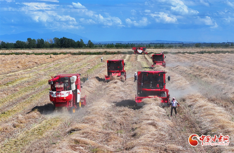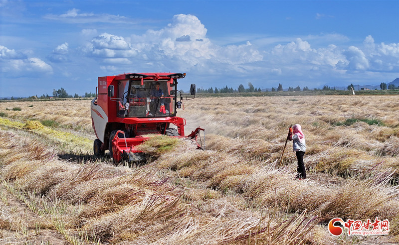 8月24日,在民樂縣新天鎮韓營村千畝油菜種植基地,村民駕駛農機在田間開展油菜籽搶收作業。