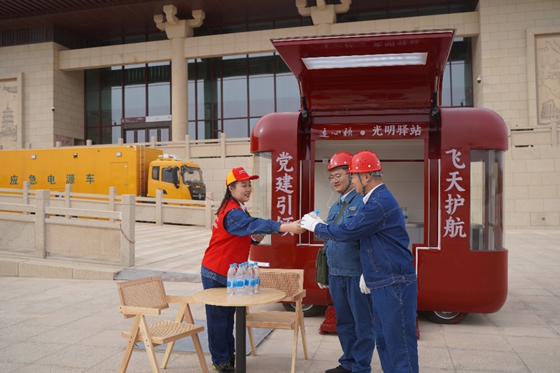 9月20日,在文博會保電現場,一個特殊的服務點吸引了來往者的目光——該公司設立的“連心橋·光明驛站”,站內設置免費充電區、應急補給區、臨時休息區,這個由國家電網甘肅電力(飛天)連心橋共產黨員服務隊和“黃河之濱”志愿者服務隊組成的服務站點,在這場文化盛會中發揮著重要作用,為各方來賓和市民游客提供全方位的貼心服務,成為文博會上一道亮麗的風景線。