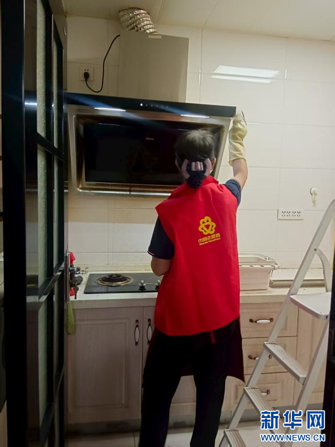 圖為蘭州市七里河區(qū)柳家營(yíng)社區(qū)巾幗家政服務(wù)驛站工作人員上門進(jìn)行廚房保潔服務(wù)。(甘肅省婦聯(lián)供圖)