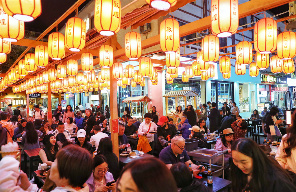 夜幕下的夜市主街區(qū),漢唐風(fēng)格的飛檐斗拱在燈光中錯(cuò)落延伸,3000余盞仿古絲綢燈籠如星河垂落,與北斗七星造型的景觀燈帶遙相呼應(yīng)。改造后的攤位統(tǒng)一采用原木色雕花圍擋,身著胡服漢裝的攤主們穿梭其間,吆喝聲與烤架升騰的煙火氣交織,恰似《敦煌廿詠》中“萬商爭利處,燈影伴駝鈴”的盛景復(fù)現(xiàn)。新設(shè)的“絲路長桌宴”區(qū)域,更將西域風(fēng)味與中原美食融合,令游客體驗(yàn)“一席嘗遍敦煌味”的舌尖之旅。