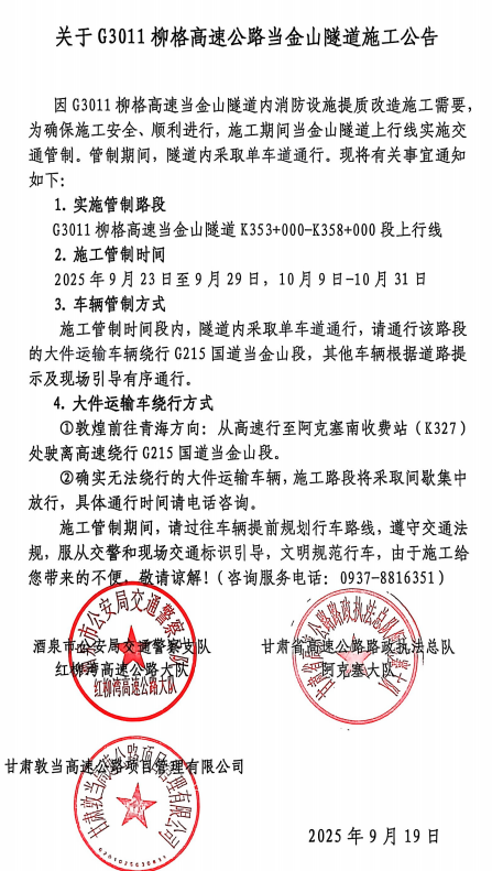 中國甘肅網(wǎng)9月22日訊(西北角·中國甘肅網(wǎng)記者 宋芳科)記者從敦當高速公路項目部門獲悉,因G3011柳格高速當金山隧道內(nèi)消防設(shè)施提質(zhì)改造施工需要,為確保施工安全、順利進行,2025年9月23日至9月29日,10月9日至10月31日,兩個時間段,G3011柳格高速當金山隧道K353+000-K358+000段上行線將實施管制。國慶期間停止施工,保障通行。