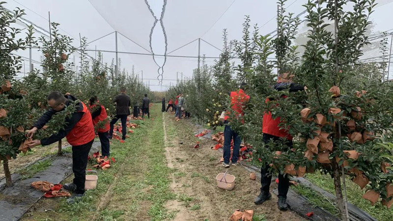 在果農岳世德家的果園里,平日里伏案工作的干部職工們,此刻化身“采摘工”,忙碌的身影在果樹間穿梭,鮮艷的紅馬甲與紅蘋果互相映襯。