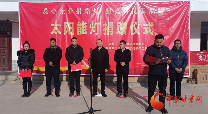 當日,隴南市委網信辦還聯合禮縣工商聯、禮縣鼎通公路橋梁工程有限公司舉辦了“愛心企業捐路燈 照亮村民幸福路”捐贈儀式,為李壩村捐贈價值5萬元的260盞太陽能路燈,助力美麗鄉村建設,照亮村莊夜晚。