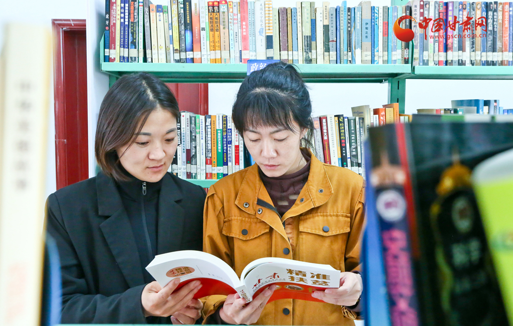 4月21日,甘肅張掖甘州區三閘鎮農家書屋內鄉村干部在挑選自己喜愛的書籍。