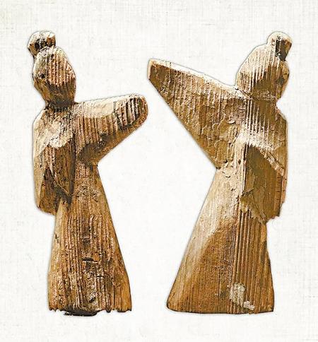 武威磨嘴子漢墓出土,現藏甘肅省博物館的兩件彩繪木舞蹈俑,其中一件寬4.9厘米,厚3.5厘米,高26.7厘米。木俑梳高髻,著長袍,身體向右傾斜,左臂置于胸前,右臂舉起,頭微側,作舞蹈狀。另一件木俑底寬5.4厘米,高14.5厘米,削制而成。以黑、紅兩色繪五官和衣領等。木俑挽高髻,穿袍服。左臂撫胸,右臂向前上舉起,身子傾斜,作舞蹈狀。它們和同一地點出土的漆樽舞蹈畫一樣,都是現實生活中官僚貴族富戶舞伎的藝術再現。