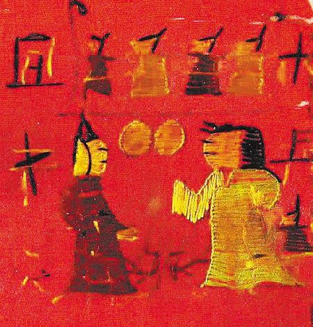 武威磨嘴子漢墓出土的一件彩繪人物木板畫,長37.6厘米,寬12.2厘米。白粉敷底,紅、黑雙彩,有相對而立的主、婢二人。黑色發髻,紅色交領寬袖深衣,均用墨線勾勒輪廓。右側還繪有一棵樹。線條流暢,形象生動。武威磨嘴子漢墓還出土了一件木板飼豬圖,長36.3厘米,寬8.1厘米,厚1.1厘米。左側墨繪穿寬袖深衣之人,高髻,右手前伸,似欲喂食,右側墨繪豬一頭,拱嘴翹尾,并用墨線繪出豬鬃,同樣顯得線條流暢生動。