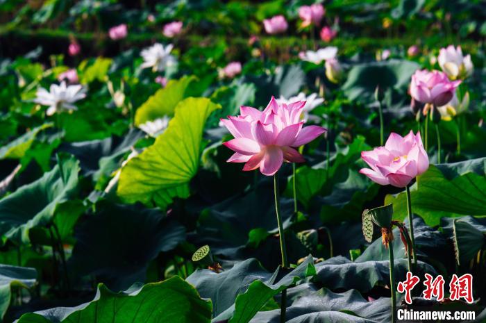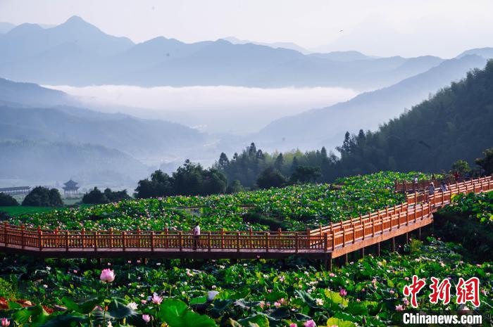 7月16日,“為荷而來”第七屆中國建蓮文化旅游節在三明市建寧縣濉溪鎮謝馬蘇梯田蓮海舉行。在梯田蓮海中放眼望去,層層疊疊的荷葉鋪滿湖面,或美麗綻放,或含苞待放。粉白淡紅的花瓣在陽光的照耀下格外嬌艷美麗。