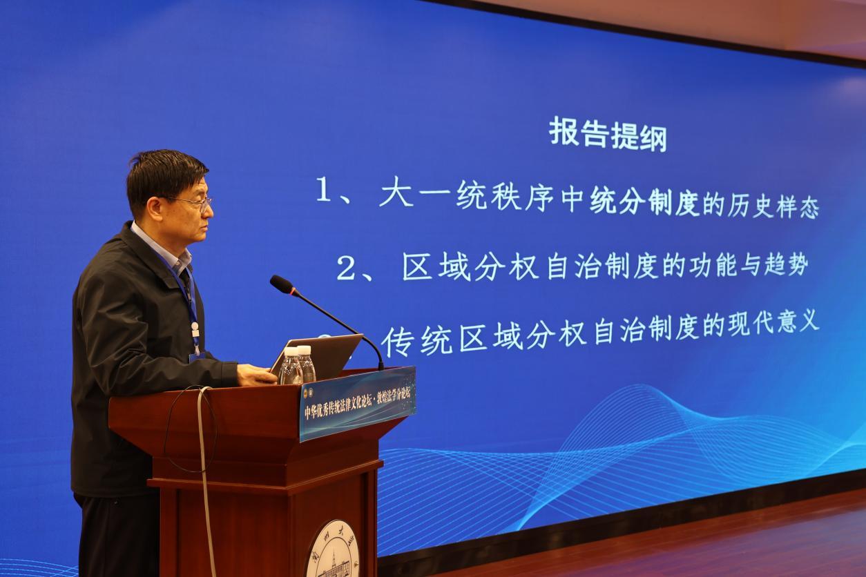 中國社會科學院法學研究所二級研究員、博士生導師、法制史研究室主任、中國法律史學會會長、第七屆“全國十大杰出青年法學家”張生,從大一統秩序中統分制度的歷史樣態、區域分權自治制度的功能與趨勢、傳統區域分權自治制度的現代意義等方面作了題為“大一統秩序下的統分制度及其現代意義”的主旨報告。