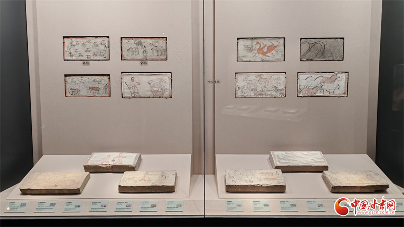 在博物館的“古冢丹青——高臺魏晉十六國時期墓葬壁畫藝術陳列”展廳里,記者看到,《二牛耕地畫像磚》生動再現了當時的農耕技術:兩頭耕牛架著直轅犁,后隨的男子一手扶犁一手揚鞭,展現了典型的“二牛抬杠”耕作方式。《牧鹿圖壁畫磚》則描繪了古人放牧鹿群的獨特場景,為研究當時的畜牧業發展提供了珍貴資料。