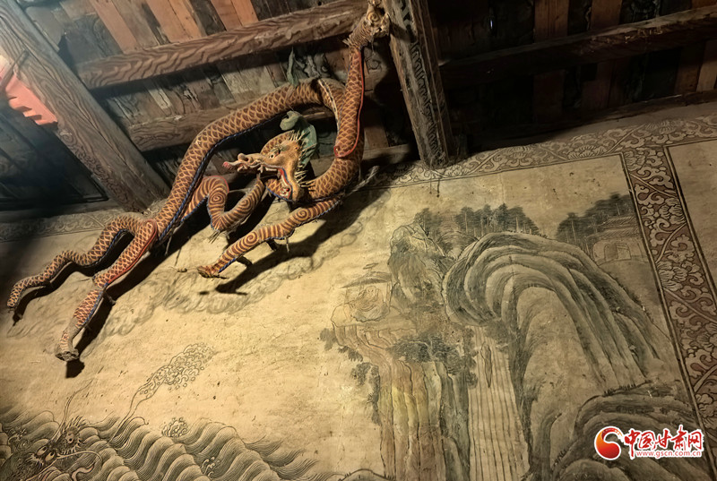 順著羅漢目視的方向望去,龍盤(pán)踞于房梁之上,若參照龍背后的壁畫(huà),又仿佛這條龍正翱翔于天空之上。這一獨(dú)特設(shè)計(jì),源于張掖大佛寺深厚的歷史背景。
