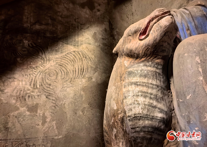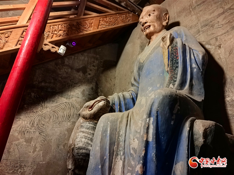 為何要將老虎塑造得如此乖巧?答案就在老虎旁邊的壁畫(huà)中。壁畫(huà)里的老虎張牙舞爪、張著大嘴,盡顯兇猛之態(tài)。而羅漢手中的老虎卻溫順如貓,這一鮮明對(duì)比,恰恰生動(dòng)地說(shuō)明了羅漢已將老虎降服。
