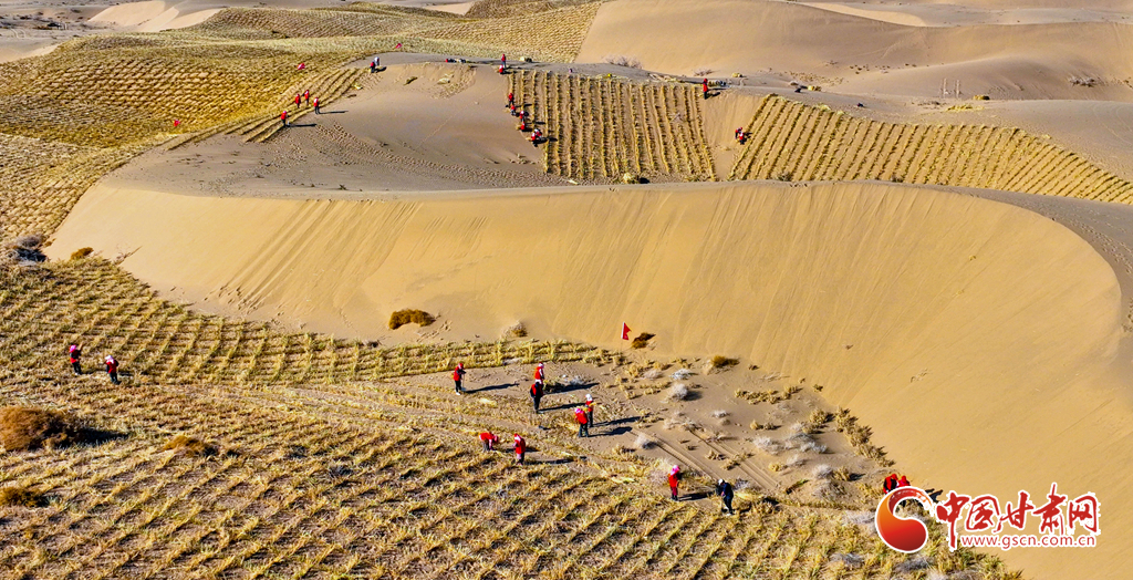 連日來,在張掖市肅南裕固族自治縣明花鄉(xiāng)西南部的干旱荒漠區(qū),運草車輛往復(fù)穿梭,1600余名治沙工人于巴丹吉林沙漠西南緣的沙丘間忙碌作業(yè)。他們劃線、背草、俯身鋪草、揮鍬壓埋,全力營建沙障與固沙林帶,為沙漠牢牢“鎖邊”。