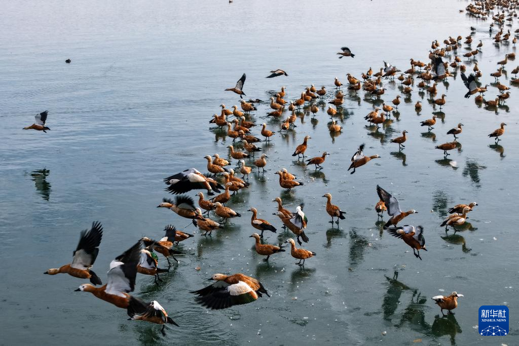 11月22日,在河西走廊東端的甘肅民勤石羊河國家濕地公園,一群赤麻鴨在紅崖山水庫嬉戲覓食。新華社記者 張智敏 攝