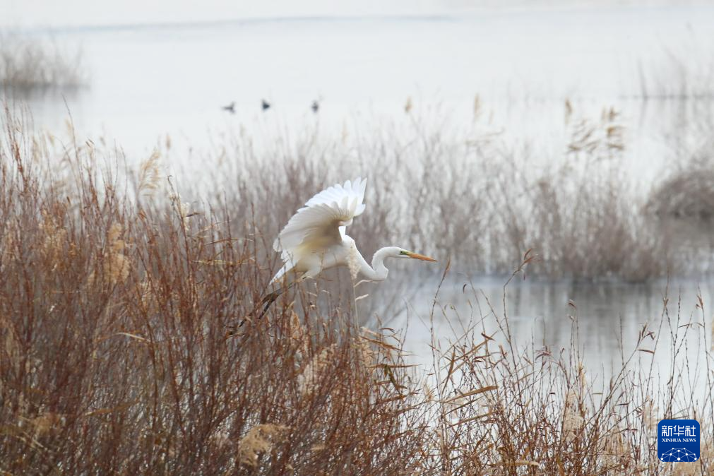 11月22日,在河西走廊東端的甘肅民勤石羊河國家濕地公園,大白鷺在紅崖山水庫飛翔。新華社記者 張智敏 攝