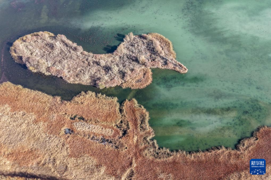 這是11月12日在河西走廊中部的張掖黑河濕地國家級自然保護區高臺段拍攝的一處湖泊(無人機照片)。新華社記者 郎兵兵 攝