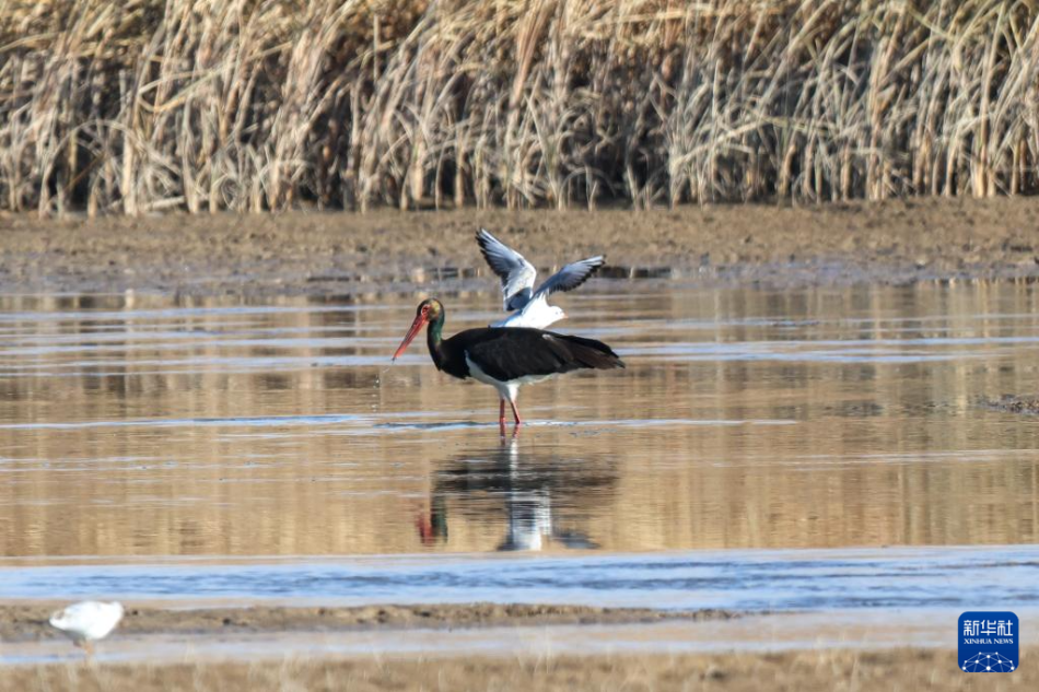11月12日,在河西走廊中部的張掖黑河濕地國家級自然保護區高臺段,國家一級保護野生動物黑鸛在一處濕地淺灘覓食。新華社記者 郎兵兵 攝