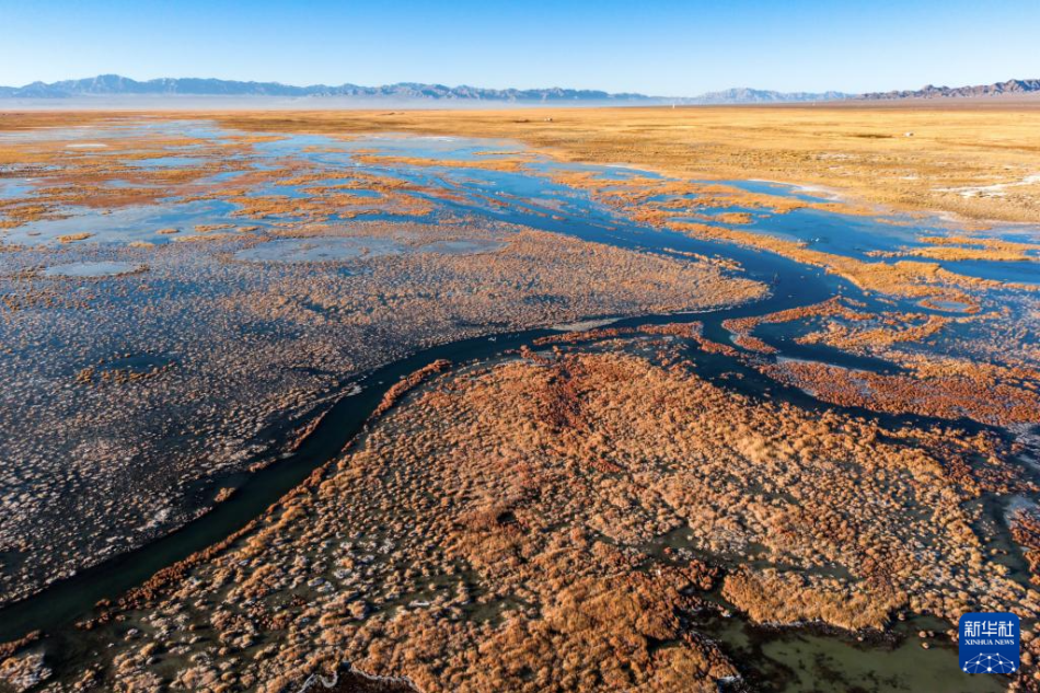 這是11月14日在河西走廊西端的甘肅省阿克塞縣小蘇干湖濕地拍攝的一片水域(無人機照片)。新華社記者 郎兵兵 攝