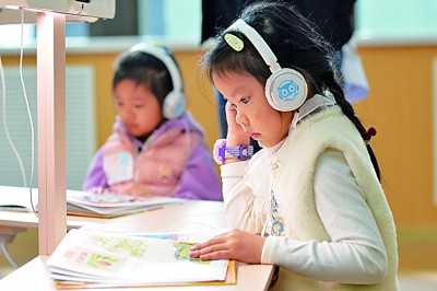 山東青島,小朋友在閱讀館體驗AI閱讀。新華社發