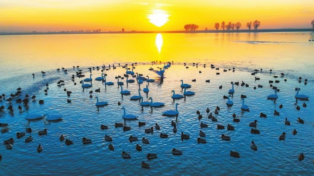 11月20日,甘肅金塔縣芨芨水庫濕地,遷徙越冬的白天鵝、赤麻鴨成群翔集湖面,成為初冬一道靚麗風景。近年來,金塔縣持續改善生態環境,加強濕地保護與修復工作,為水鳥提供了理想的棲息場所,每年在此棲息的候鳥多達數萬只。 奔流新聞·蘭州晨報通訊員 曹紅祖 李鵬 段金龍 攝