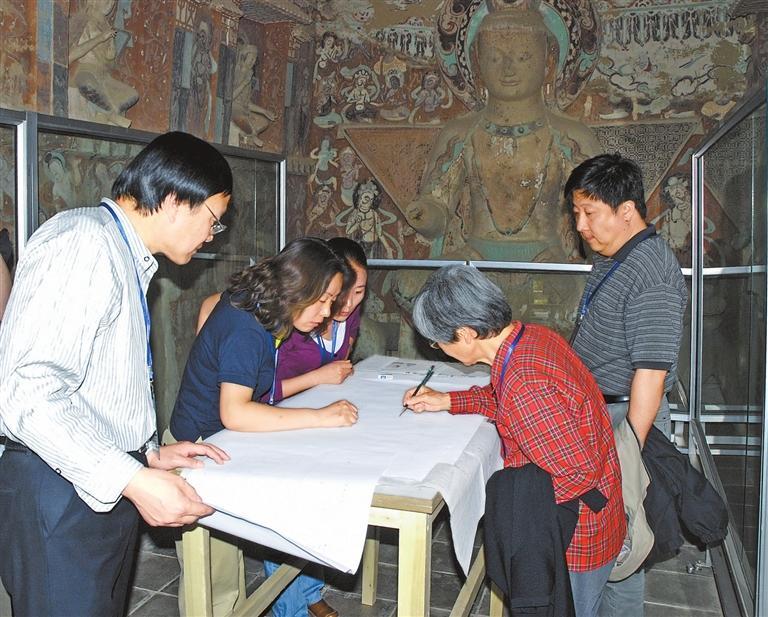 樊錦詩帶領項目團隊在莫高窟第275窟核對石窟考古報告測繪圖。