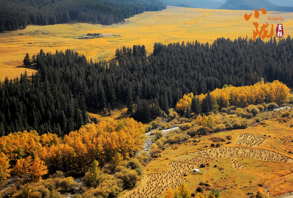 天高地闊,遠處的松柏依舊蒼翠,近處的草原褪去綠意,染成溫柔的淺黃,牛羊點綴其間,游人盡享悠然時光,草原遼闊而寧靜,富有詩意。